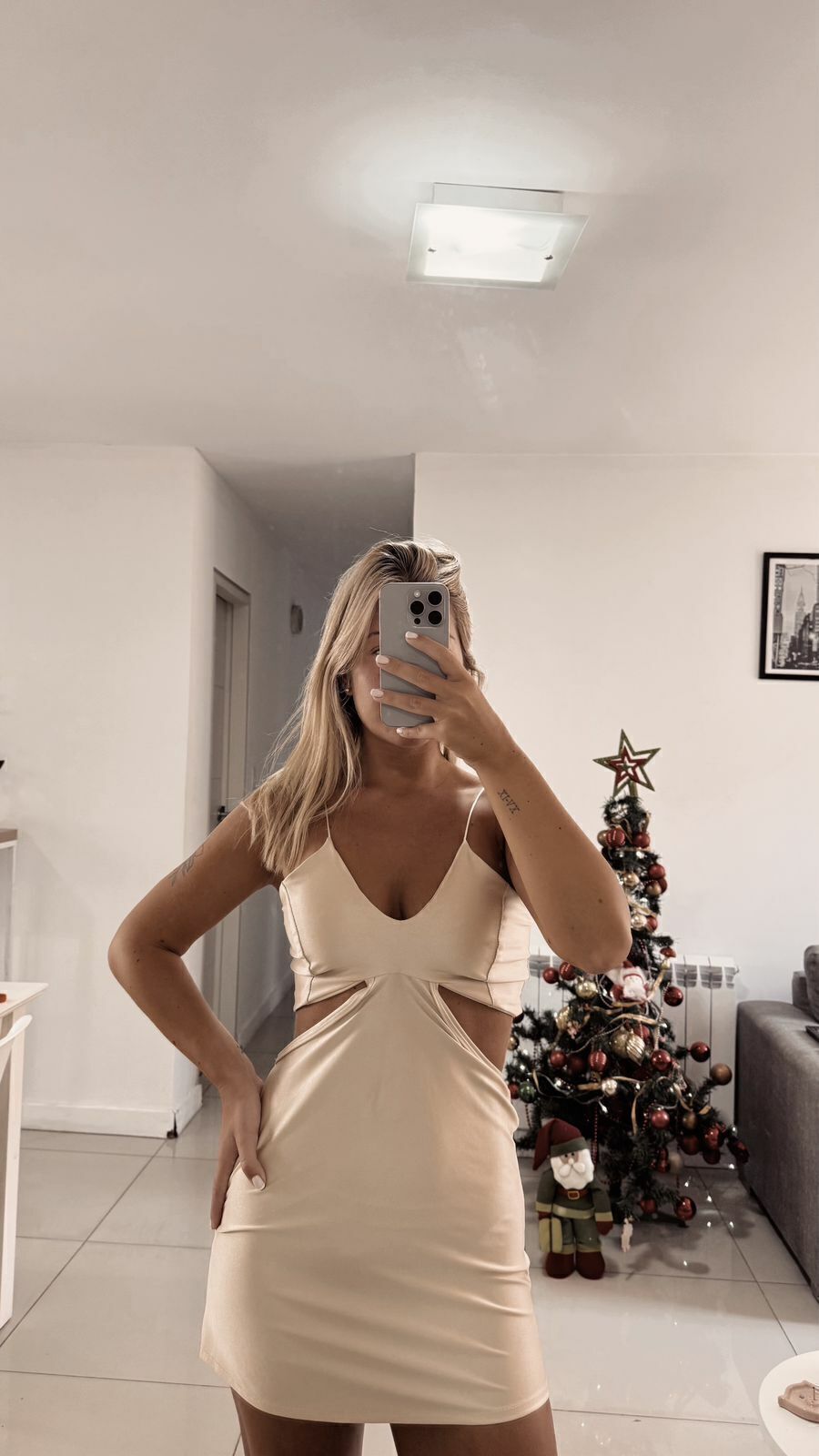 Vestido confeccionado en lycra spandex en soft peach, esta tela es super suave, evita el roce de las lentejuelas con la piel y ademas es super elastizada, convirtiendolo en un vestido adaptable a todo tipo de cuerpo. Ademas, la parte trasera del busto es ajustable para mayor comodidad.